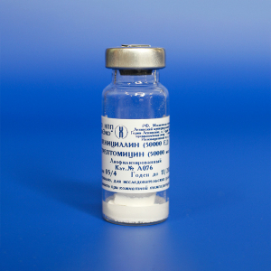 МЕХАНИЗМ ДЕЙСТВИЯ АНТИБИОТИКОВ: Стрептомицина сульфат в низких концентрациях оказывает бактериостатическое действие. Проникая внутрь микробной клетки, связывается со специфическими белками-рецепторами на 30S субъединице бактериальной рибосомы, нарушая образование инициирующего комплекса «матричная РНК + 30S субъединица рибосомы», что приводит к распаду полирибосом. Вследствие этого возникают дефекты при считывании информации с ДНК, синтезируются неполноценные белки, что в итоге приводит к остановке роста и развития микробной клетки. Пенициллин G участвует в нарушении образования клеточной стенки бактерий путем необратимого связывания с пенициллиносвязывающими белками, что вызывает гибель клеток.